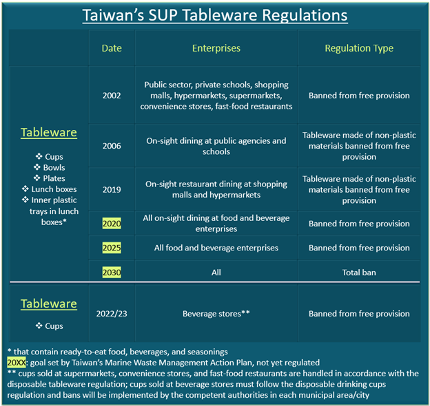 Taiwan was one of the earliest actors to address SUPs, beginning with its 2002 ban on providing plastic bags free of charge across seven types of enterprises (i.e., fast-food restaurants, retail stores, schools, etc.). Over the past two decades, Taiwan has sought to achieve a continuous decline in SUP consumption by gradually expanding restrictions. The government first prohibits the free provision of specific SUP items in certain types of enterprises, then expands the restrictions to additional items and types of enterprises. Taiwan has set its policies at the national level but sometimes leaves the implementation and ban date up to municipal areas. In 2018 (updated in 2020), Taiwan released the Marine Waste Management Action Plan (in Chinese), outlining its primary goal of banning many SUPs by 2030. Below is a snapshot of this phased approach for one specific SUP category: tableware.