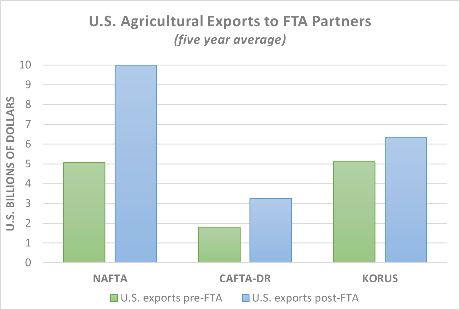 Similar inroads have been made in some Asian markets. In Korea, for example, exports of U.S. agricultural products have increased 53 percent since the implementation of the U.S.-Korea trade agreement (KORUS), which prominently included the elimination of Korean tariffs on over 95 percent of U.S. exports.