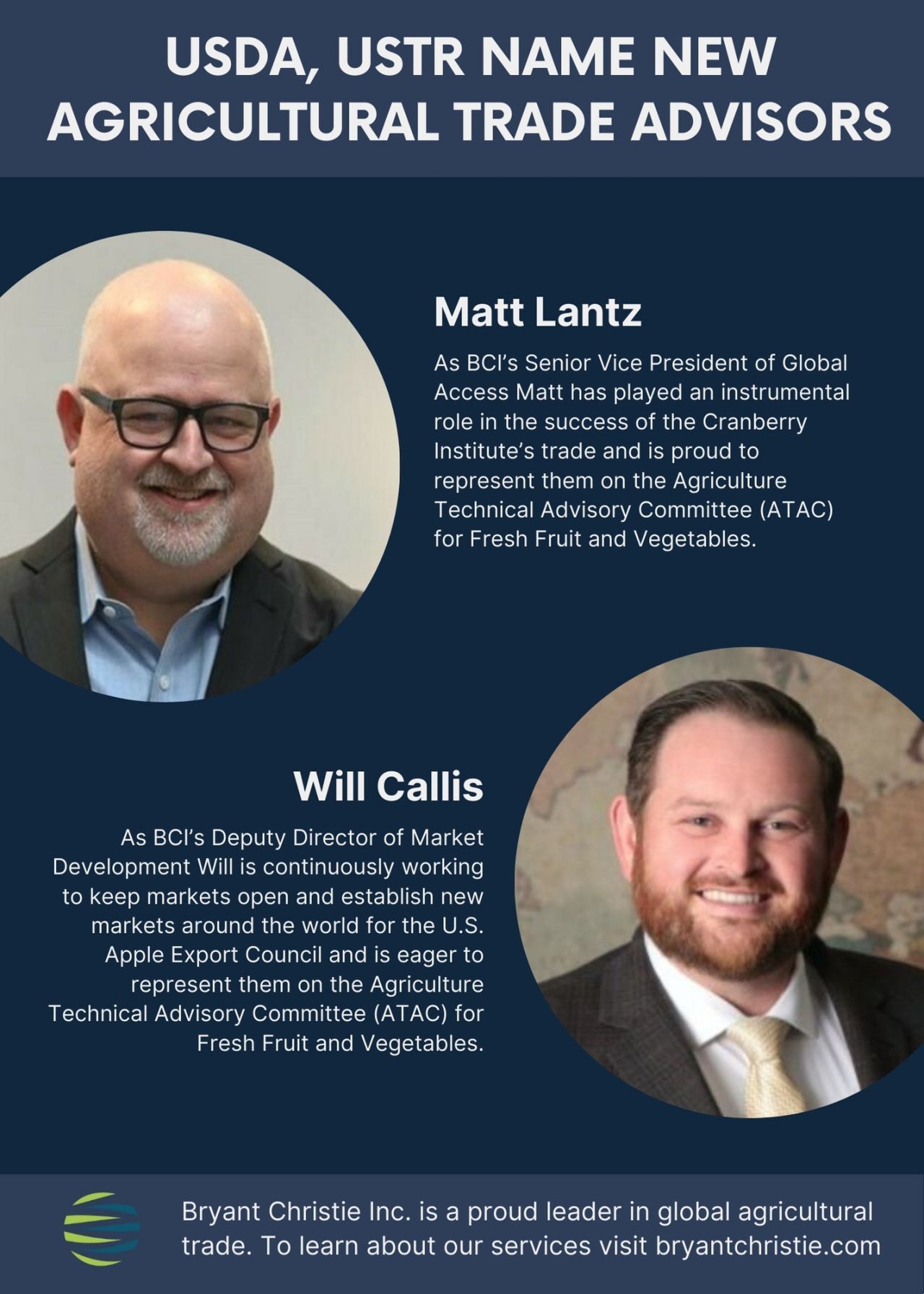 We are thrilled to announce that BCI’s Matt Lantz and Will Callis have been reappointed to the USDA and the Office of the U.S. Trade Representative’s Agricultural Technical Advisory Committee for Fruits and Vegetables.