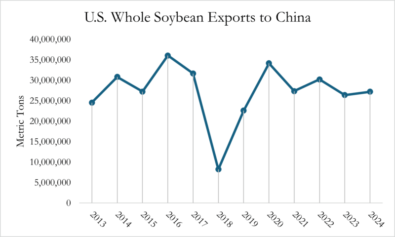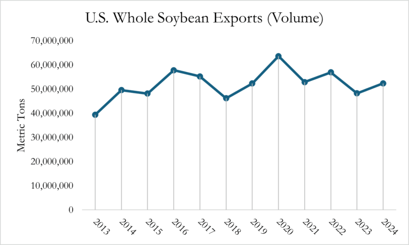 Let’s turn our attention back to the real world and the U.S.-China soybean market. Used primarily in animal feeds, whole soybeans consistently rank as the U.S.’ top agricultural export, making it both an economic boon to the country as well as a potential target for retaliation.