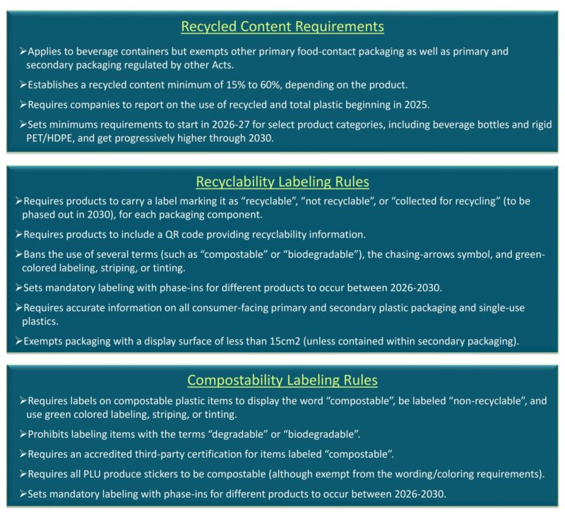 Currently in the pipeline are two additional plastics policies. First, Canada is developing regulations that would establish minimum recycled content requirements for plastics and labeling rules for recyclability and compostability, detailed in the chart below. Consultation on the proposed Regulatory Framework Paper concluded in May and draft regulations are targeted for publication by the end of 2023, with the final regulation to be published before the end of 2024.